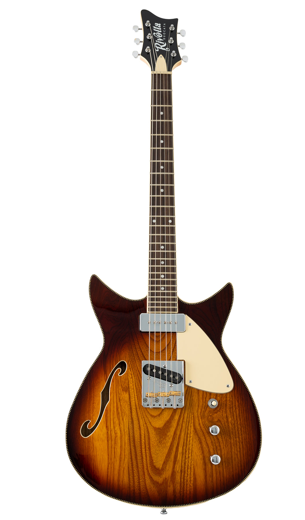 {"id":6935749820501,"title":"Rivolta Duocata Classico","handle":"rivolta-duocata","description":"\u003ch5\u003eStory\u003c\/h5\u003e\n\u003cdiv class=\"fa-g63wun\"\u003eIntroducing the new Rivolta DUOCATA. Sporting a brand new body silhouette from the mind of Dennis Fano, the DUOCATA is the first non-offset design in the Rivolta line-up.\u003cspan class=\"fa-m06e1l\"\u003e \u003cbr\u003e\u003cbr\u003e\u003c\/span\u003e\n\u003c\/div\u003e\n\u003cdiv class=\"fa-g63wun\"\u003eFeatures include ivory checkerboard binding, tone-chambered ash body with Rivolta F-Hole, set Maple neck construction, our new C++ chunky neck profile, Rosewood fretboard, 25” scale, 24 jumbo frets, T-style bridge and an ultra smooth satin neck finish. Our new proprietary DUOCATA matched pickups (P90 in neck and T-Style in bridge) offer clear, crisp articulation and balanced tone.\u003cbr\u003e\u003cbr\u003e\n\u003c\/div\u003e\n\u003cdiv class=\"fa-g63wun\"\u003eThe Rivolta DUOCATA is everything you’d expect from a classic thinline guitar and more!\u003c\/div\u003e\n\u003cdiv class=\"face1oy4\"\u003e\u003cbr\u003e\u003c\/div\u003e\n\u003ch5\u003eFeatures and Specs\u003c\/h5\u003e\n\u003cdiv style=\"font-size: 0.875rem;\" class=\"fa-g63wun\"\u003e\n\u003cul\u003e\n\u003cli\u003e\n\u003cspan style=\"font-size: 0.875rem;\"\u003eBody Wood: Chambered Ash with \u003c\/span\u003e\u003ci style=\"font-size: 0.875rem;\"\u003eF-Hole\u003c\/i\u003e\u003cbr\u003e\n\u003c\/li\u003e\n\u003cli\u003e\n\u003cspan style=\"font-size: 0.875rem;\"\u003eNeck Wood: Maple\u003c\/span\u003e\u003cbr\u003e\n\u003c\/li\u003e\n\u003cli\u003e\n\u003cspan style=\"font-size: 0.875rem;\"\u003eFretboard Wood: Indian Rosewood\u003c\/span\u003e\u003cbr\u003e\n\u003c\/li\u003e\n\u003cli\u003e\n\u003cspan style=\"font-size: 0.875rem;\"\u003eFrets: 24 x Nickel, Jumbo\u003c\/span\u003e\u003cbr\u003e\n\u003c\/li\u003e\n\u003cli\u003e\n\u003cspan style=\"font-size: 0.875rem;\"\u003eBody Binding: Top and Back - Ivory Checkerboard\u003c\/span\u003e\u003cbr\u003e\n\u003c\/li\u003e\n\u003cli\u003e\n\u003cspan style=\"font-size: 0.875rem;\"\u003eNeck Binding: Ivory\u003c\/span\u003e\u003cbr\u003e\n\u003c\/li\u003e\n\u003cli\u003e\n\u003cspan style=\"font-size: 0.875rem;\"\u003eHeadstock Binding: Ivory\u003c\/span\u003e\u003cbr\u003e\n\u003c\/li\u003e\n\u003cli\u003e\n\u003cspan style=\"font-size: 0.875rem;\"\u003eF-Hole Binding: Ivory\u003c\/span\u003e\u003cbr\u003e\n\u003c\/li\u003e\n\u003cli\u003e\n\u003cspan style=\"font-size: 0.875rem;\"\u003eFretboard Inlay: Pearloid\u003c\/span\u003e\u003cbr\u003e\n\u003c\/li\u003e\n\u003cli\u003e\n\u003cspan style=\"font-size: 0.875rem;\"\u003ePick guard Material: 3-Ply Parchment Ivory\u003c\/span\u003e\u003cbr\u003e\n\u003c\/li\u003e\n\u003cli\u003e\n\u003cspan style=\"font-size: 0.875rem;\"\u003eTruss Rod Cover Material: 3-Ply Parchment Ivory\u003c\/span\u003e\u003cbr\u003e\n\u003c\/li\u003e\n\u003cli\u003e\n\u003cspan style=\"font-size: 0.875rem;\"\u003eControl Cavity Plate material: Parchment Ivory\u003c\/span\u003e\u003cbr\u003e\n\u003c\/li\u003e\n\u003cli\u003e\n\u003cspan style=\"font-size: 0.875rem;\"\u003eHardware: Chrome\u003c\/span\u003e\u003cbr\u003e\n\u003c\/li\u003e\n\u003cli\u003e\n\u003cspan style=\"font-size: 0.875rem;\"\u003eBridge: 'Wilkinson' Chrome Tele bridge with compensated brass saddles, String Thru-body\u003c\/span\u003e\u003cbr\u003e\n\u003c\/li\u003e\n\u003cli\u003e\n\u003cspan style=\"font-size: 0.875rem;\"\u003eKnobs: Chrome Dome Style\u003c\/span\u003e\u003cbr\u003e\n\u003c\/li\u003e\n\u003cli\u003e\n\u003cspan style=\"font-size: 0.875rem;\"\u003ePickups: \u003cbr\u003eNeck - Chrome P90 (\u003c\/span\u003e\u003ci style=\"font-size: 0.875rem;\"\u003e6.8K, Alnico 5 magnets, 43 AWG wire\u003c\/i\u003e\u003cspan style=\"font-size: 0.875rem;\"\u003e)\u003c\/span\u003e\u003cspan style=\"font-size: 0.875rem;\"\u003e \u003cbr\u003eBridge - Tele Single Coil (\u003c\/span\u003e\u003ci style=\"font-size: 0.875rem;\"\u003e8k, Alnico 5 magnets, 43 AWG wire\u003c\/i\u003e\u003cspan style=\"font-size: 0.875rem;\"\u003e)\u003c\/span\u003e\u003cbr\u003e\n\u003c\/li\u003e\n\u003cli\u003e\n\u003cspan style=\"font-size: 0.875rem;\"\u003ePots: 250k\u003c\/span\u003e\u003cbr\u003e\n\u003c\/li\u003e\n\u003cli\u003e\n\u003cspan style=\"font-size: 0.875rem;\"\u003eSwitch: 3-way Toggle\u003c\/span\u003e\u003cbr\u003e\n\u003c\/li\u003e\n\u003cli\u003e\n\u003cspan style=\"font-size: 0.875rem;\"\u003eSwitch Tip: Ivory\u003c\/span\u003e\u003cbr\u003e\n\u003c\/li\u003e\n\u003cli\u003e\n\u003cspan style=\"font-size: 0.875rem;\"\u003eTuners: Chrome\u003c\/span\u003e\u003cbr\u003e\n\u003c\/li\u003e\n\u003cli\u003e\n\u003cspan style=\"font-size: 0.875rem;\"\u003eString Gauge: 10-46\u003c\/span\u003e\u003cbr\u003e\n\u003c\/li\u003e\n\u003c\/ul\u003e\n\u003cp\u003e\u003cstrong\u003e\u003ca href=\"\/products\/rivolta-duocata-lh\"\u003e\u003cspan style=\"font-size: 0.875rem;\"\u003eLEFT-HAND OPTION AVAILABLE!\u003c\/span\u003e\u003c\/a\u003e\u003c\/strong\u003e\u003c\/p\u003e\n\u003c\/div\u003e\n\u003cul\u003e\u003c\/ul\u003e\n\u003ch5\u003eCase Fit\u003c\/h5\u003e\n\u003cul\u003e\n\u003cli\u003e\n\u003cstrong\u003ePremium Soft Case:\u003c\/strong\u003e\u003cem\u003e\u003cstrong\u003e \u003ca href=\"\/products\/rivolta-premium-case\"\u003eOptional Add-On\u003c\/a\u003e\u003c\/strong\u003e\u003c\/em\u003e\n\u003c\/li\u003e\n\u003c\/ul\u003e","published_at":"2024-03-28T12:59:32-04:00","created_at":"2023-06-15T10:04:56-04:00","vendor":"Rivolta","type":"Guitar","tags":["Body: Tone-Chambered","Pickups: P90","Pickups: Single Coil","Right Hand","RWP","spo-cs-disabled","spo-default","spo-disabled","spo-enabled","spo-notify-me-disabled","Stock","Vibrato: No"],"price":109900,"price_min":109900,"price_max":109900,"available":true,"price_varies":false,"compare_at_price":null,"compare_at_price_min":0,"compare_at_price_max":0,"compare_at_price_varies":false,"variants":[{"id":40686546387029,"title":"Ambra Burst","option1":"Ambra Burst","option2